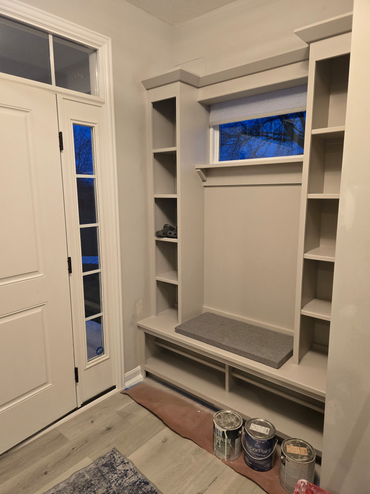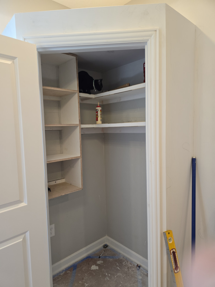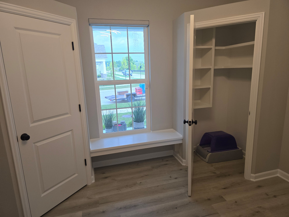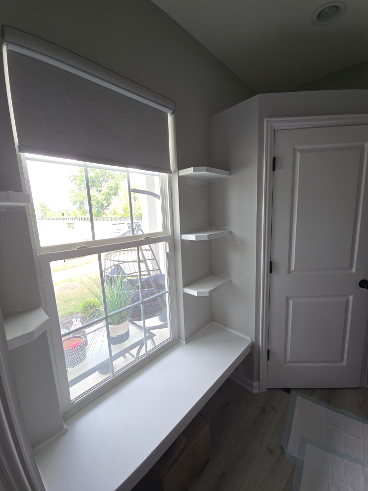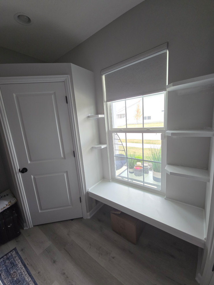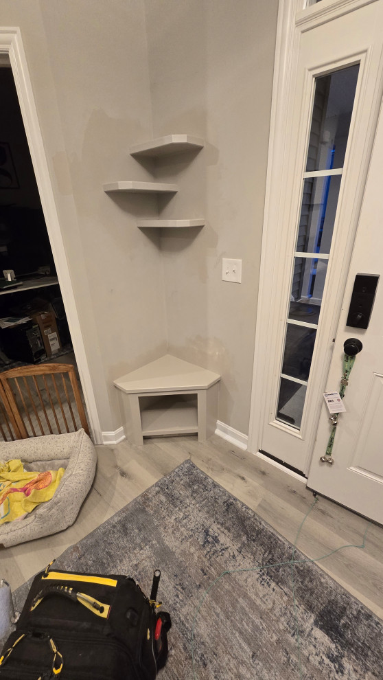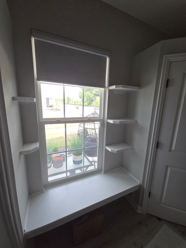 client needed closets in a dining room she planned to use as an office/bedroom.. we choose twin corner closets with a bench between so it looked intentional and floating shelves above.. the open windows seat conceals the access for the kitties to get tocthe liter box's... the closets have built in shelves for office supplies extra kitty treats has plenty of extra storage.. the client also wanted a bench for shoes and coats in a niche locatated in the foyer we added the second corner seat with additional floating shelves utilizing the same edge details as in the office to bring continuity to the spaces.. we also matched the color on the bench with a butlers bar that ajoins the foyer and kitchen which is a vaient of a eat in style kitchen