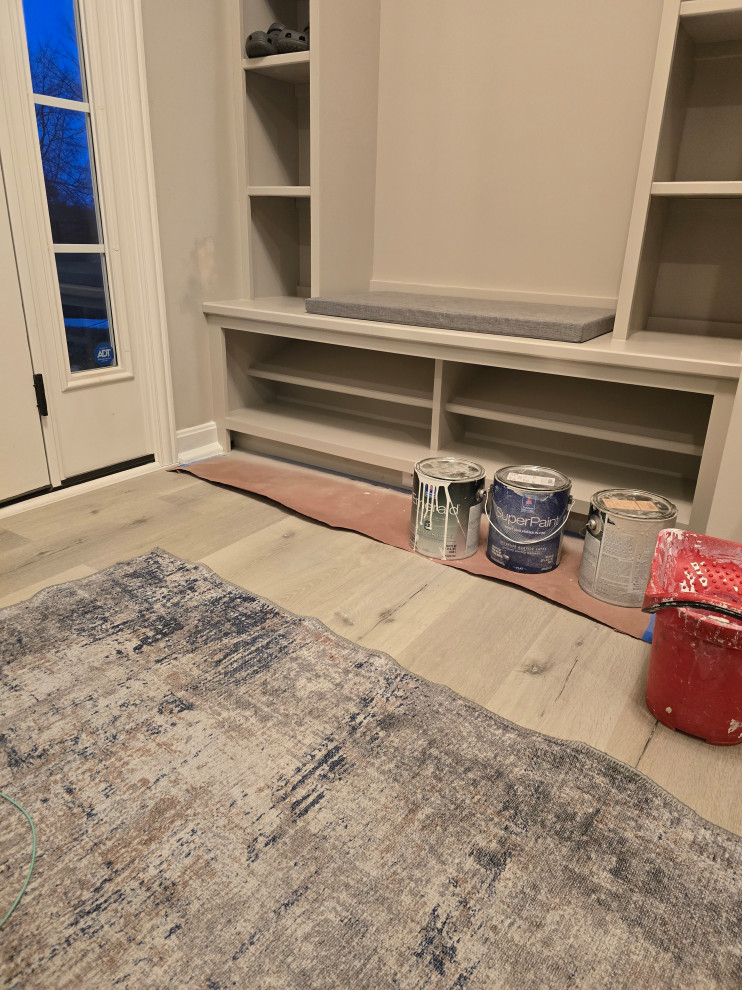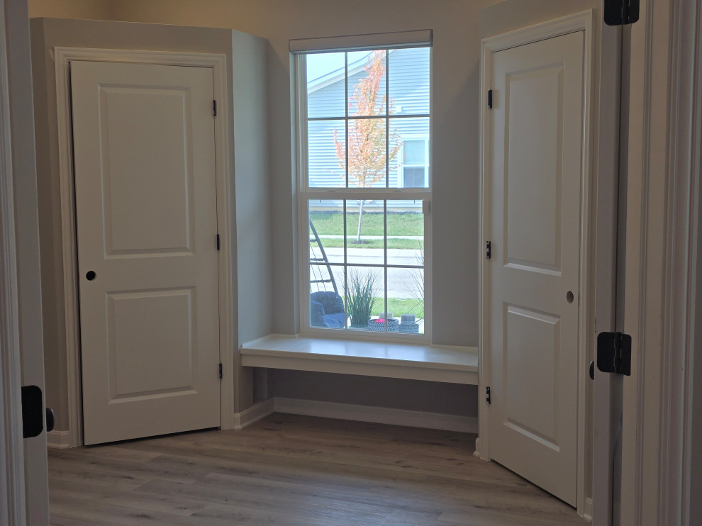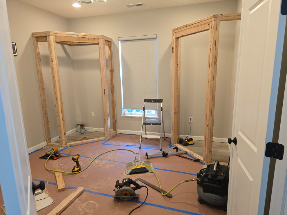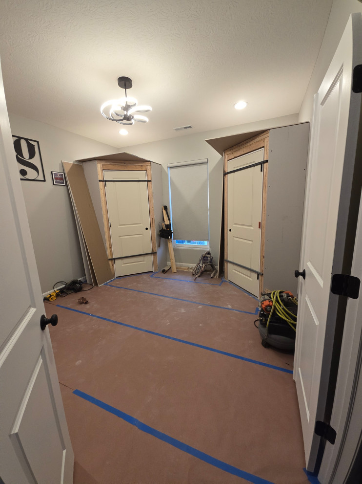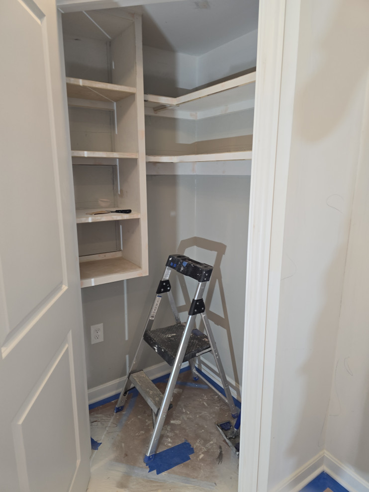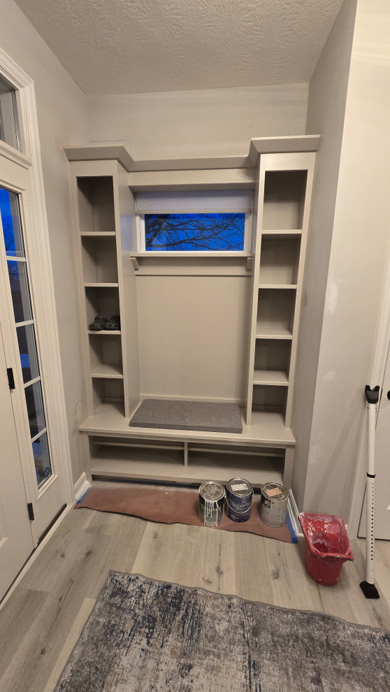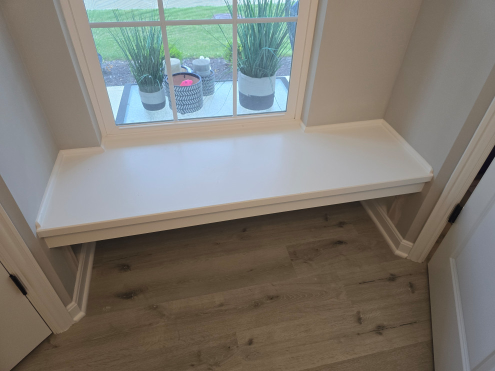 client needed closets in a dining room she planned to use as an office/bedroom.. we choose twin corner closets with a bench between so it looked intentional and floating shelves above.. the open windows seat conceals the access for the kitties to get tocthe liter box's... the closets have built in shelves for office supplies extra kitty treats has plenty of extra storage.. the client also wanted a bench for shoes and coats in a niche locatated in the foyer we added the second corner seat with additional floating shelves utilizing the same edge details as in the office to bring continuity to the spaces.. we also matched the color on the bench with a butlers bar that ajoins the foyer and kitchen which is a vaient of a eat in style kitchen