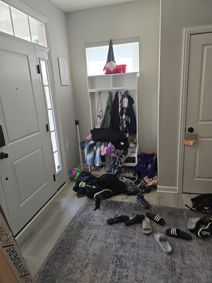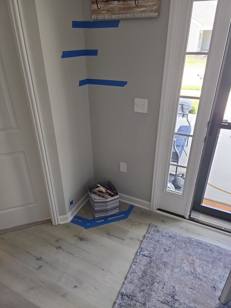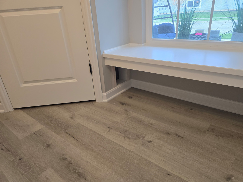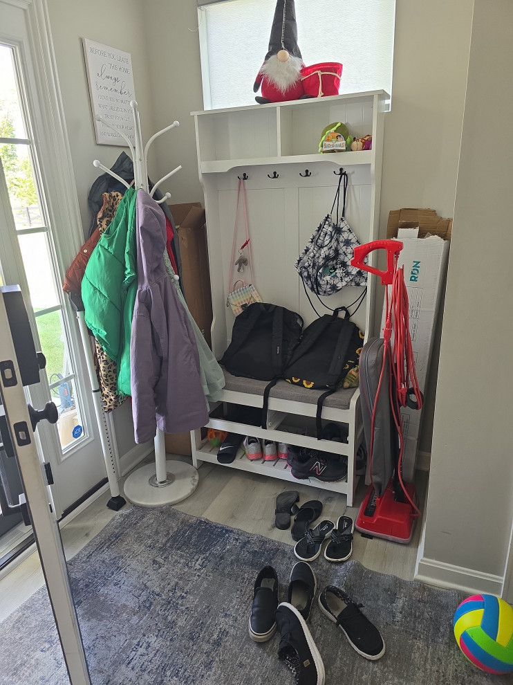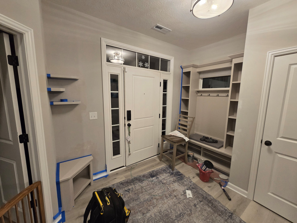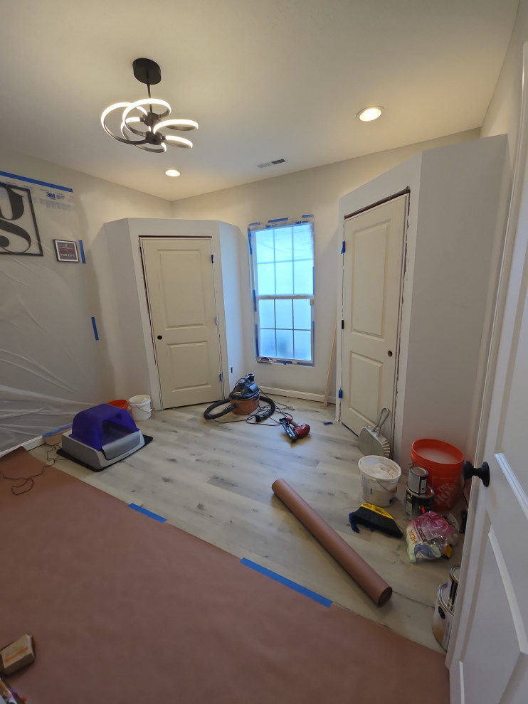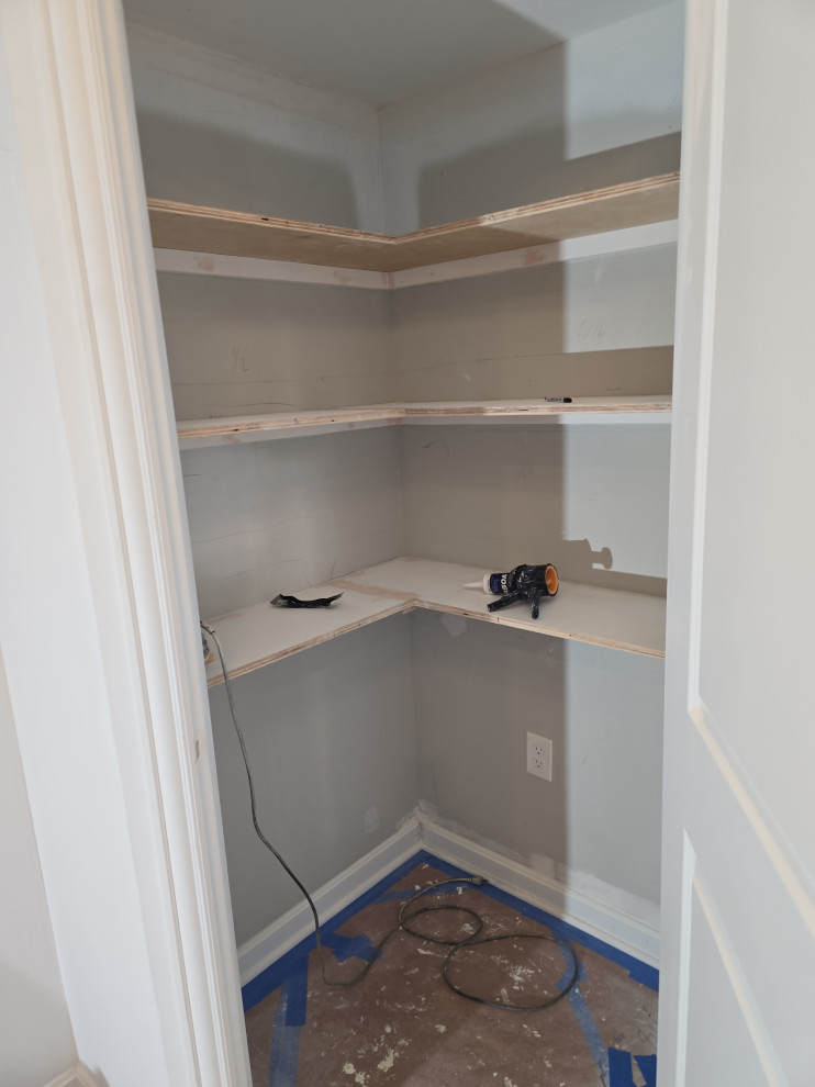 client needed closets in a dining room she planned to use as an office/bedroom.. we choose twin corner closets with a bench between so it looked intentional and floating shelves above.. the open windows seat conceals the access for the kitties to get tocthe liter box's... the closets have built in shelves for office supplies extra kitty treats has plenty of extra storage.. the client also wanted a bench for shoes and coats in a niche locatated in the foyer we added the second corner seat with additional floating shelves utilizing the same edge details as in the office to bring continuity to the spaces.. we also matched the color on the bench with a butlers bar that ajoins the foyer and kitchen which is a vaient of a eat in style kitchen
